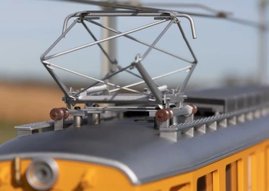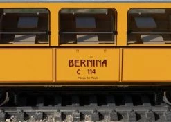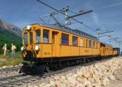 This is a model of the RhB class Abe 4/4 powered rail car for use on the Bernina Line. The unit is in the yellow paint scheme of the beginning of the Bernina Railroad, thus as it is still used currently as a museum unit. The paint scheme and lettering are prototypical for Era VI. All four wheelsets are driven by two powerful Bühler motors. The model has an mfx/DCC decoder with many light and sound functions. It also has interior details, the doors can be opened, the model has traction tires, and there is cab lighting. Length over the buffers 64 cm / 25-3/16″.